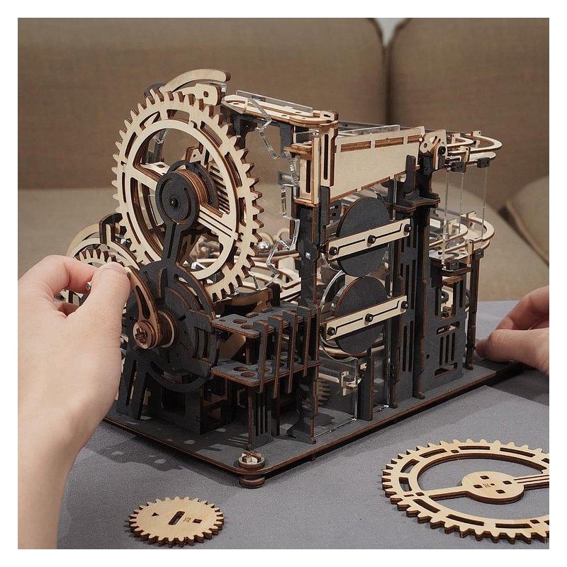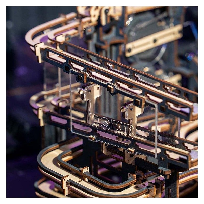 Robotime-ROKR Marble Night City is based on great human engineering. This marble run product combines the beauty of science and machines, involving so many small gadgets. It is a self-assembly 3D wooden puzzle with Tower Distributors & track race balls. Build the set and crank the handle. Watch marbles run crazy down the slopes and twisting turns. Breakthrough material restrictions and incorporate high-transparent acrylic. With a funnel-shaped track, the total length is extended to 2.5 meters. Rotate the handle, the steel ball will reciprocate along the track to experience the creativity of precision machinery with this wooden marble run puzzle.