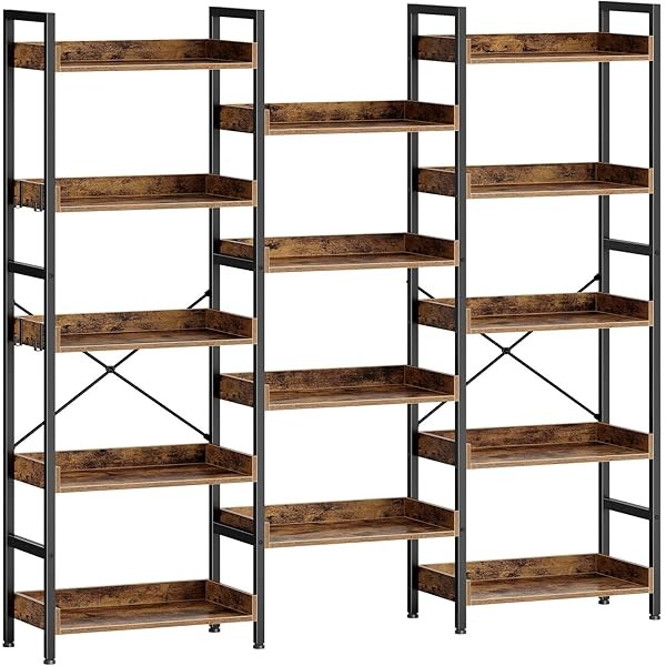 Rolanstar Bookshelf 5 Tiers with 4 Hooks, Triple Bookcase with Open Display Shelves, Industrial Wide Bookshelf with Metal Frame for Living Room, Office, Rustic Brown