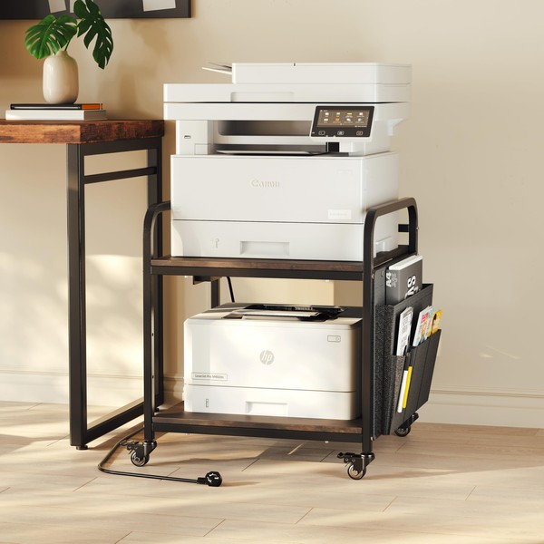 RoleDec 2-Tier Large Under Desk Printer Stand with Storage, 3D Printer Table with Height Adjustable Shelf & Charging Plug, Rolling Cart with Wheels for Home Office (Rustic Brown)