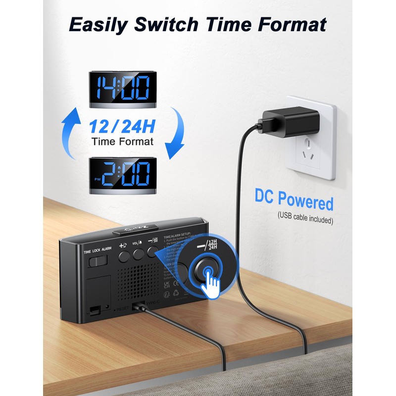 - 【USB Powered & 12/24H】For this kids alarm clock, only powered by USB (USB cable included, adapter not included). When the power is off unexpectedly, the battery built into the bedside clock can automatically save time & alarm settings (the time won't be displayed, and the alarm won't sound), not need to reset it again when the power is on12/24H time format optional.