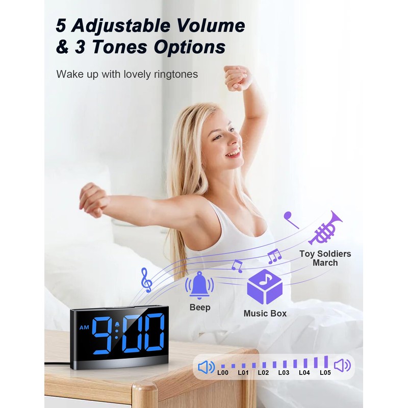 - 【3 Alarm Tones & 5 Alarm Volumes】Our alarm clocks bedside have 5 levels of alarm volume adjustment that can be set from 0-110db. No need to worry about the alarm being too loud or soft. There are 3 fixed ringing music sounds (Beep, Music Box, and Toy Soldiers March) that you can choose from. Note: When the volume is set to L00 (mute mode), the alarm will be canceled, and the alarm icon on the display will disappear.