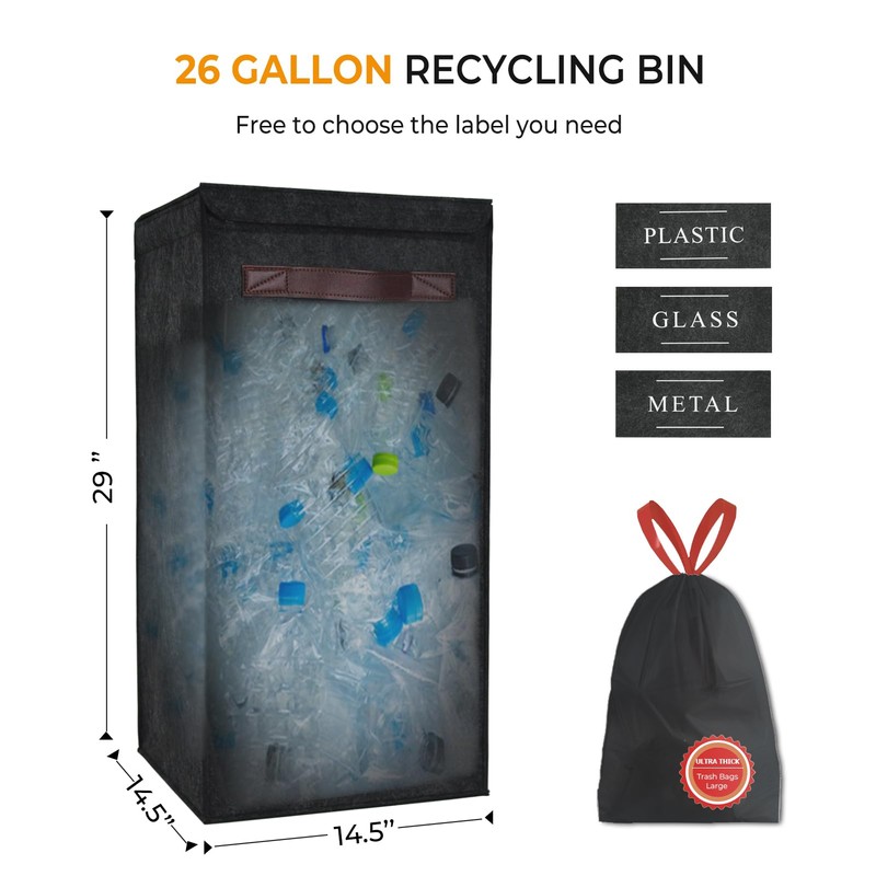 - Large Capacity: The size of the recycle trash can is 14.5*14.5*29 inches. The large recycling bin has a capacity of 26 gallons,100L, making it ideal for household bottle storage needs. Its spacious dimensions provide ample space to store empty bottles, making it the perfect choice for families looking to maintain an organized living space
