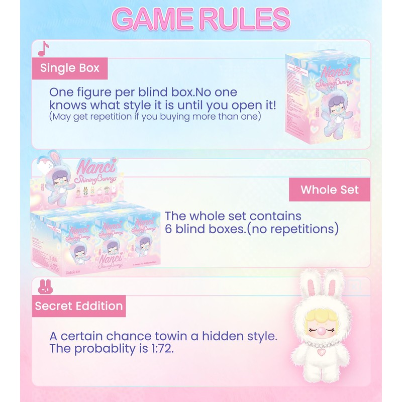 - Blind Box Surprise – Each blind box contains 1 random Nanci Shining Bunny design. The surprise lies in the mystery—no one knows which adorable figure is inside until you open it.