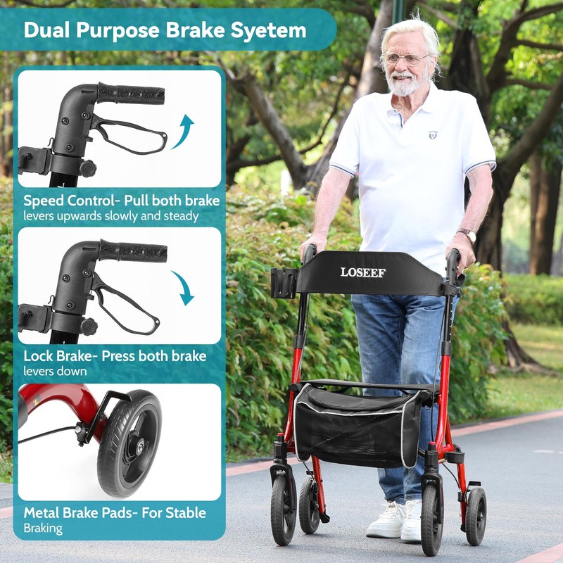 • 10 Inch Rubber Wheels - LOSEEF rollator walker features large rubber wheels (10" front, 8" back), 360° swivel for smooth rolling, non-slip, shock absorption for outdoors such as bumpy roads, gravel, concrete, grass, etc. This is particularly for users who prioritize comfort and joint health.