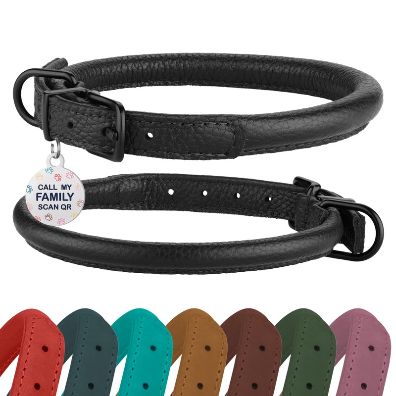 Rolled Leather Dog Collar Soft Round Collars, ID Tag for Small Medium Large Dogs (7-10 inch, Black Midnight)