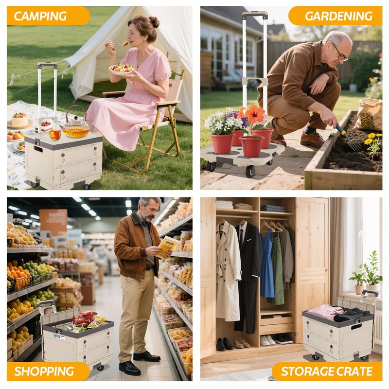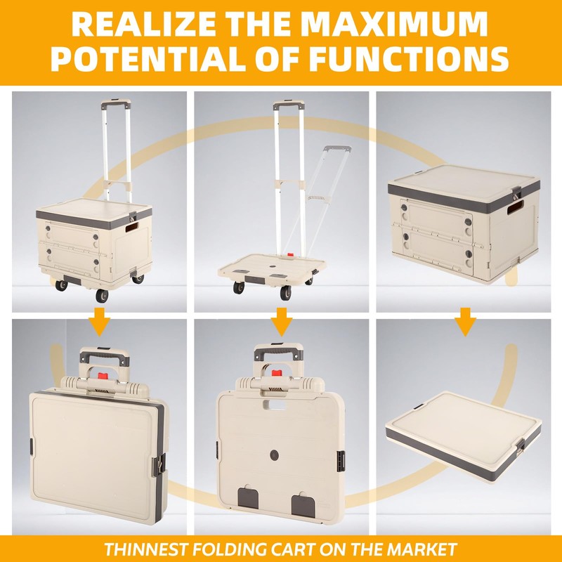 - 2-in-1 Multifunctional Foldable Cart: Featuring a removable covered crate, this cart effortlessly transforms to meet diverse needs—use it as a stable platform cart for bulky items, a convenient shopping cart for errands, or stackable storage bins for organized keeping. Perfect for teachers, camping trips, grocery shopping, and sorting office supplies.