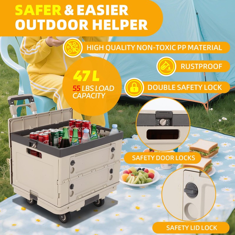 Rolling Crate Cart with Wheels,2 in 1 Utility Cart with Lockable Lids,132 lbs Foldable Shooping Cart with Aluminum Handle, Silent Wheel