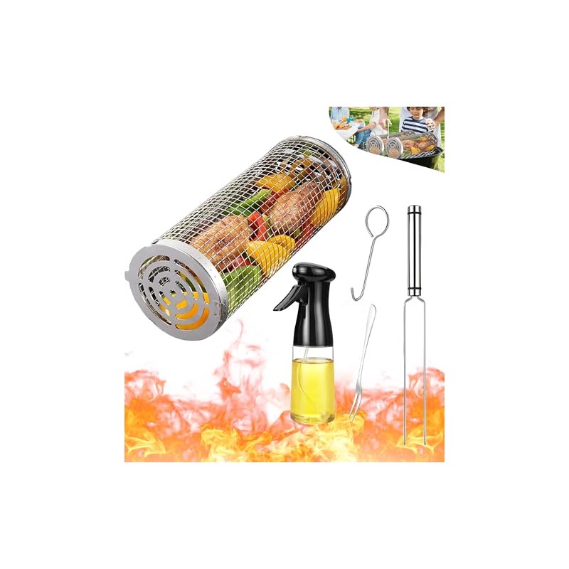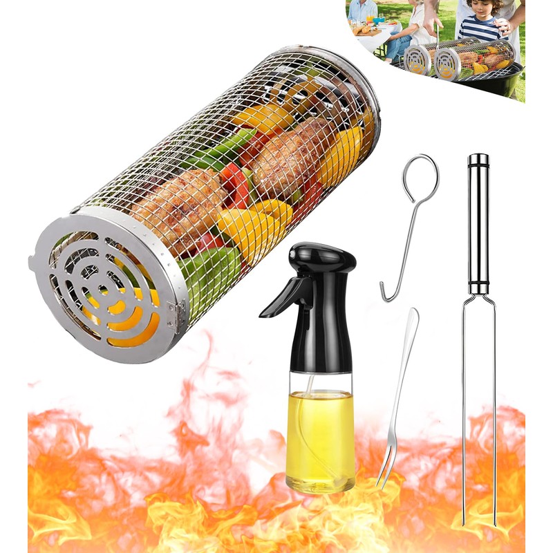 Rolling Grilling Baskets for Outdoor Grill Bbq Stainless Steel Round Net Tube Mesh Barbecue Cage Cylinder Cooking Accessories for Camping, Gift for Men