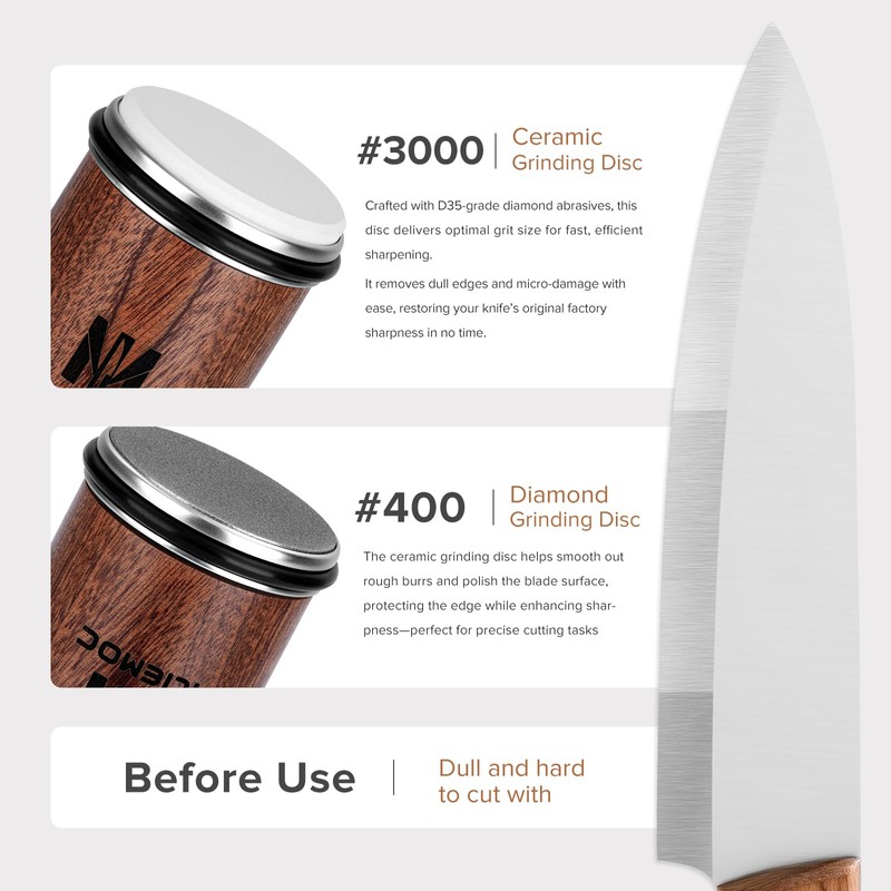 - 【Diamond & Ceramic Discs for Precision】Equipped with #400 diamond and #3000 ceramic wheels, the kitchen knife sharpener restores dull edges and finishes them to a mirror-like polish. Use the diamond for reshaping, then refine with ceramic, ensuring serious, long-lasting performance.