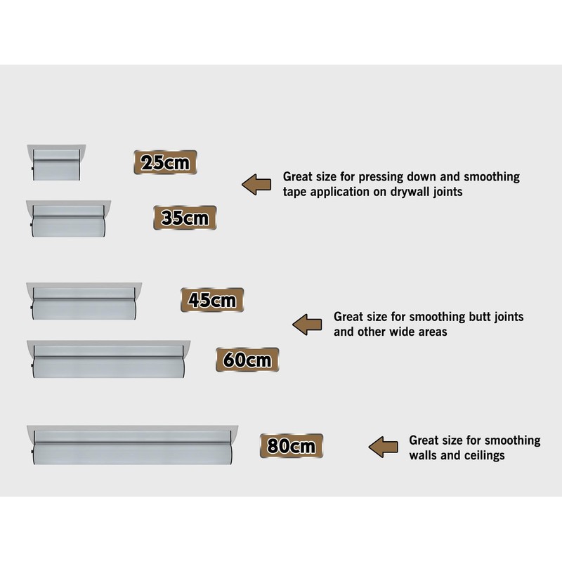 - STAINLESS STEEL EDGE: Each of the 5 different skimming blades has a 0.3mm thick #201 stainless steel blade to offer the best flex possible. Every skimming blade comes with one extra blade for replacement. Sizes include 25cm (9.84"), 35cm (13.78"), 45cm (17.72"), 60cm (23.62"), 80cm (31.50") for uses covering everything from crack and small hole repairs to taping joints, to skimming walls and ceilings