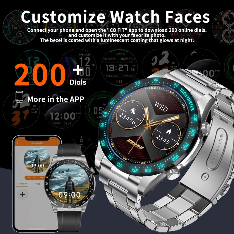 - 1,43-Zoll-AMOLED-Touchscreen : Diese Smartwatch Herren verfügt über einen 1,43-Zoll-AMOLED-Bildschirm mit einer Auflösung von 466 x 466 Pixeln für hohe Auflösung und lebendige Farben. Ob Sie Benachrichtigungen abrufen, Fitnessdaten überprüfen oder Multimedia-Inhalte genießen, der Bildschirm bietet ein außergewöhnliches visuelles Erlebnis. In der "CO FIT"-App können Sie aus über 150 verschiedenen Ziffernblättern mit anpassbaren Ziffernblättern wählen. Übersetzt mit www.DeepL.com/Translator (kostenlose Version)