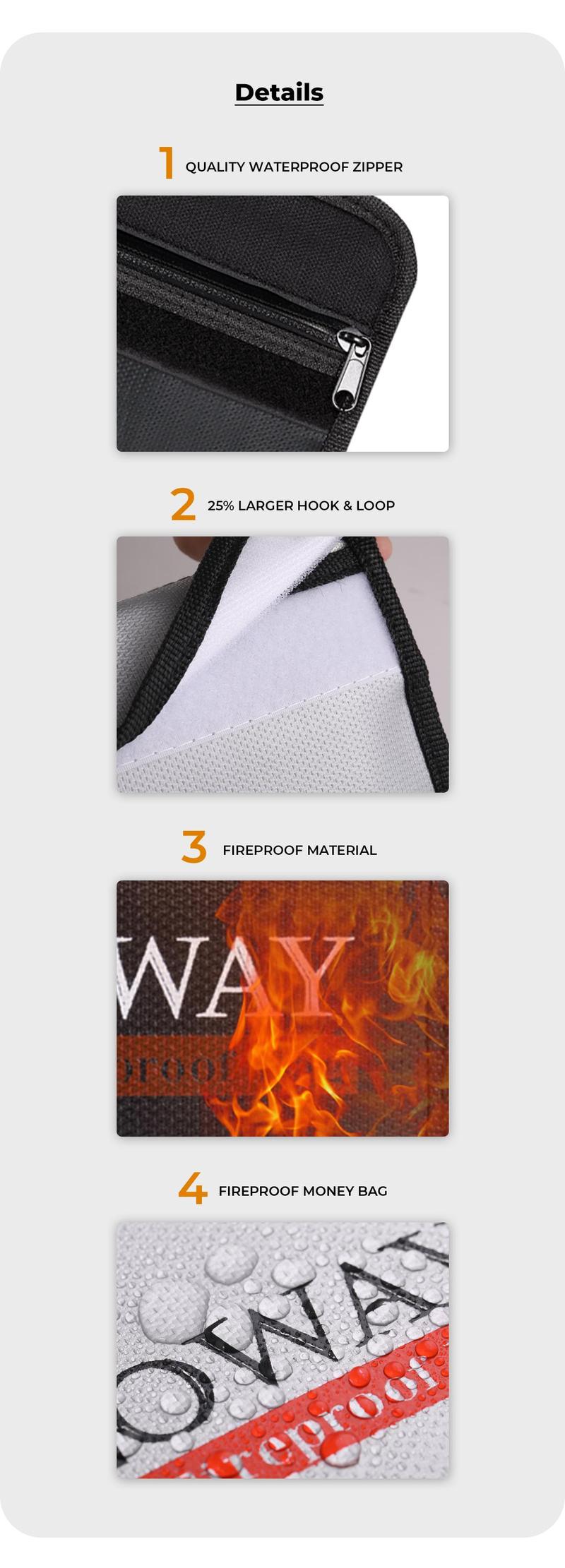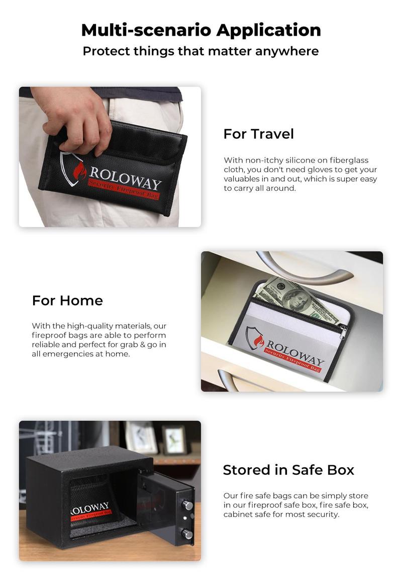 - [HIGH QUALITY & DURABLE FIRE PROOF BAGS]: With all the High Quality Dual-layer Fiberglass Material, Non-itchy Silicone Coating, Durable Hook & Loop Closure, our fireproof money bags are Durable enough, and Perfect for your daily and emergency use. Please note we suggest to store our fireproof bags in a fire safe box for more security.