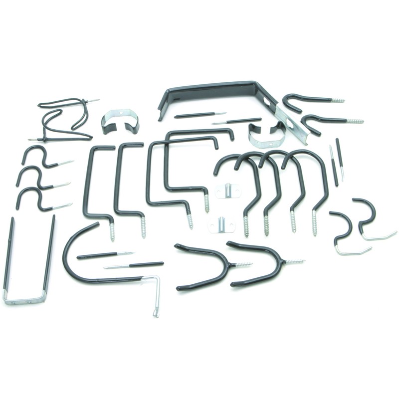 - Spade holder, hose holder, 2pc ceiling hooks, 2pc ladder hooks, 3pc hooks, 4pc cycle hooks, 2pc ski hooks and cable holder