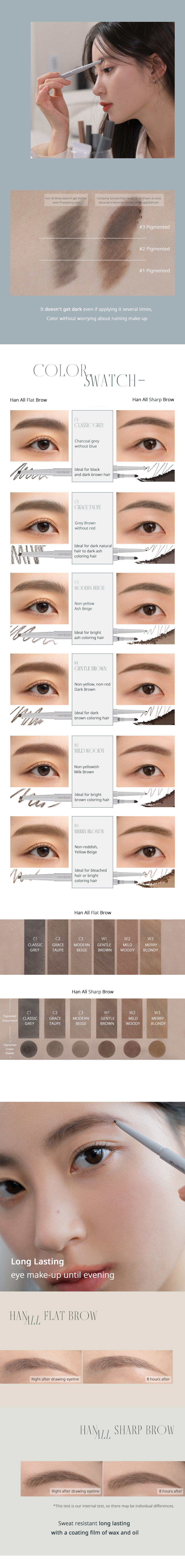 C1 Classic Grey: Charcoal grey color C2 Grace Taupe: Grey brow color C3 Modern Beige: Ash beige color W1 Gentle Brown: Dark brown color W2 Mild Woody: Milk brown color W3 Merry Blondy: Yellow beige color