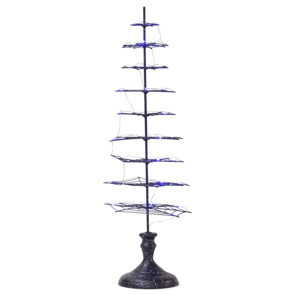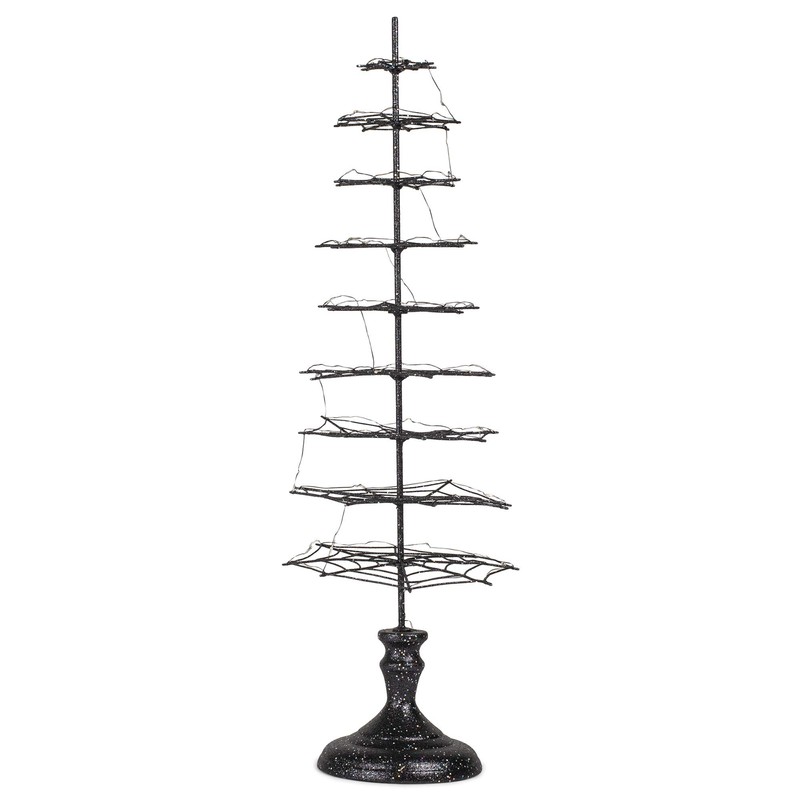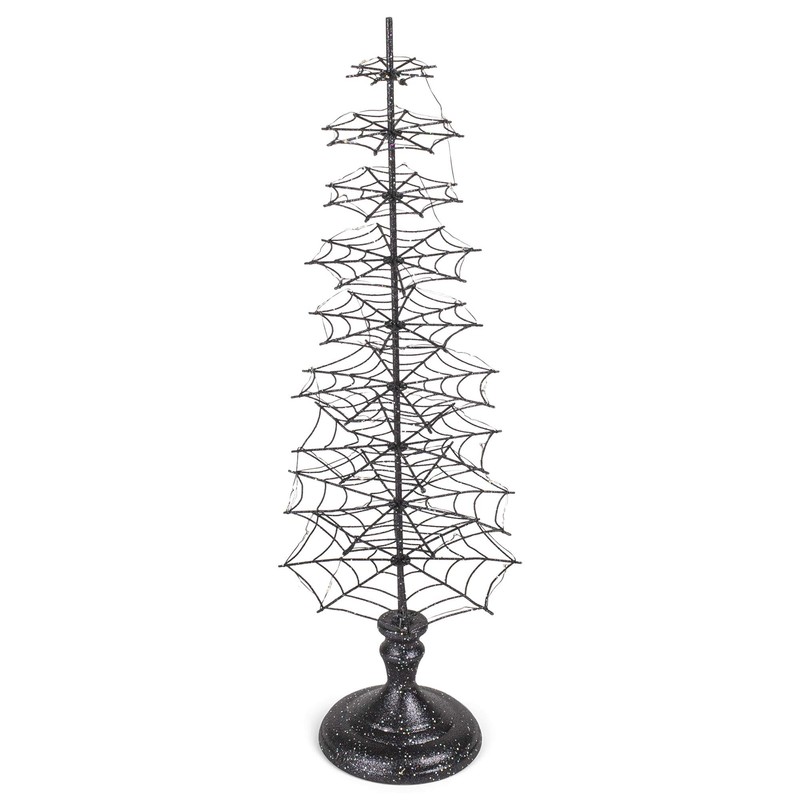 • Add some spook to your living space with this lighted spider web tree; Features midnight black coloring with speckled glitter; Each web layer is illuminated with small LED lights