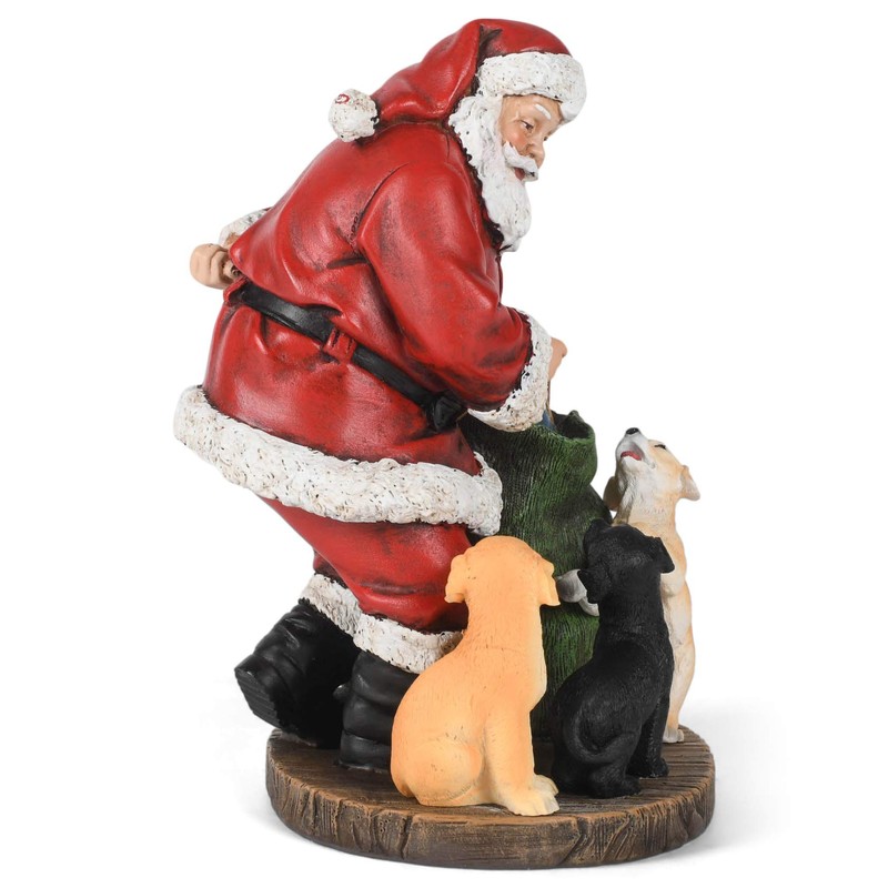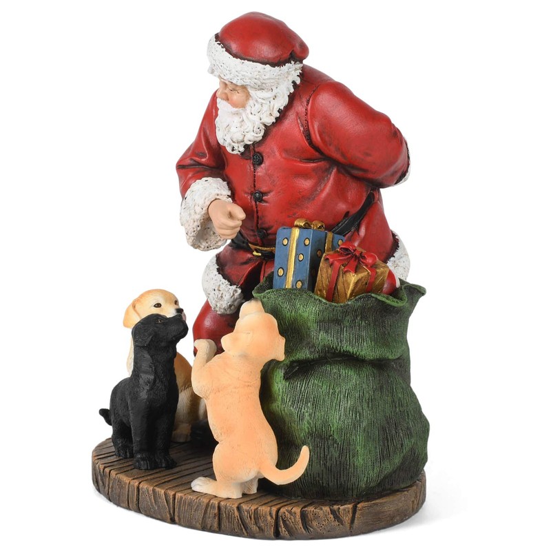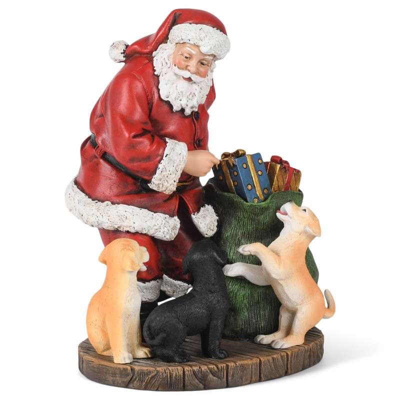 - Add some charm to your living space with this whimsical figurine; Features Santa with frolicking puppies and bag of presents