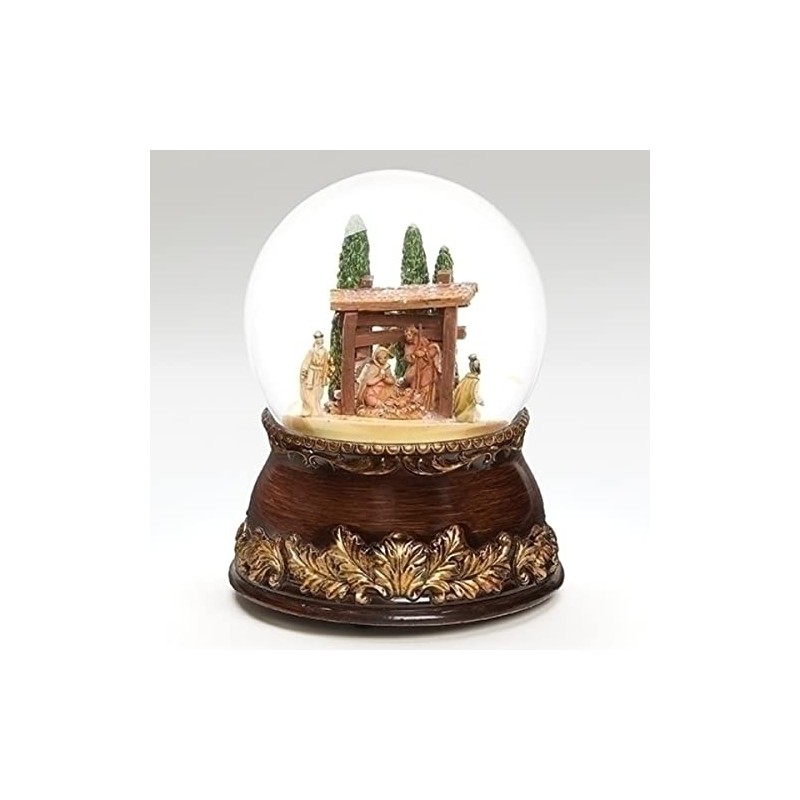 120mm glass globe with kneeling Fontanini Holy Family inside with a flurry of golden glitter when you give it a shake. Wind up music box plays: We Three Kings. The woodtone base is cast in polyresin with a running leaf design. Musical Nativity glitterdome measurements 6.75"H 5.25"W 5.25"D