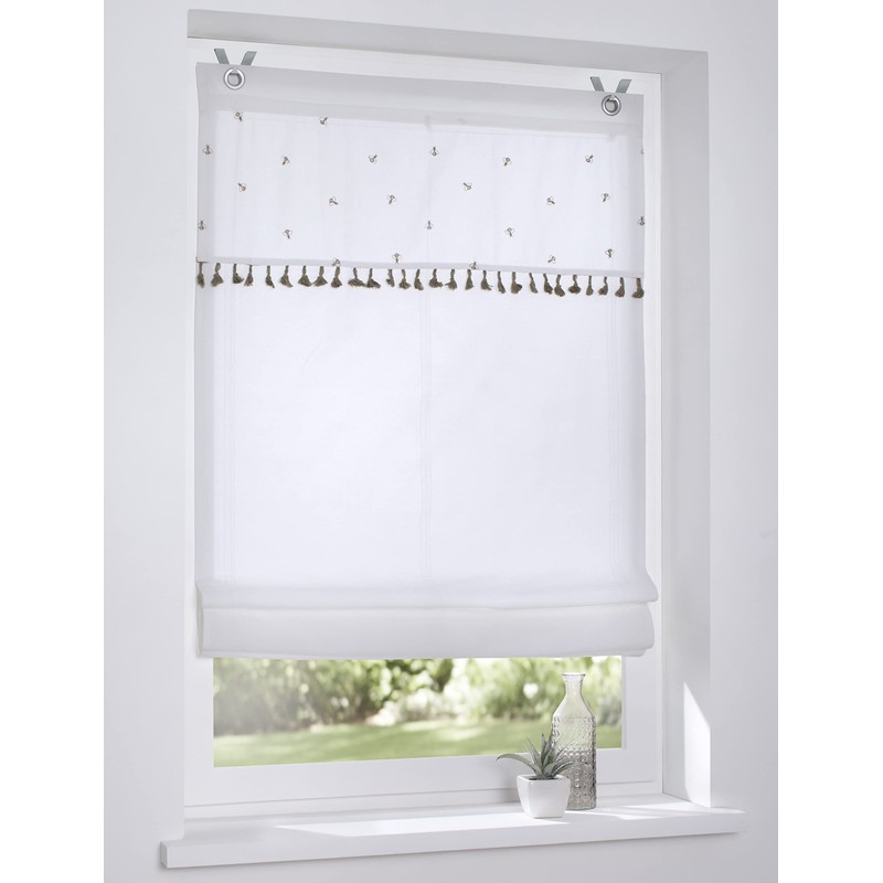 - Design Roman blind: white eyelet roller blind with all-over embroidery 'bee' natural colour, cover with romantic tassels, heavy cotton quality for beautiful fall. Enchanting Roman blind in country house style, romantic look. Shabby style home textiles. For kitchen, living room, bedroom, bathroom and children's room.