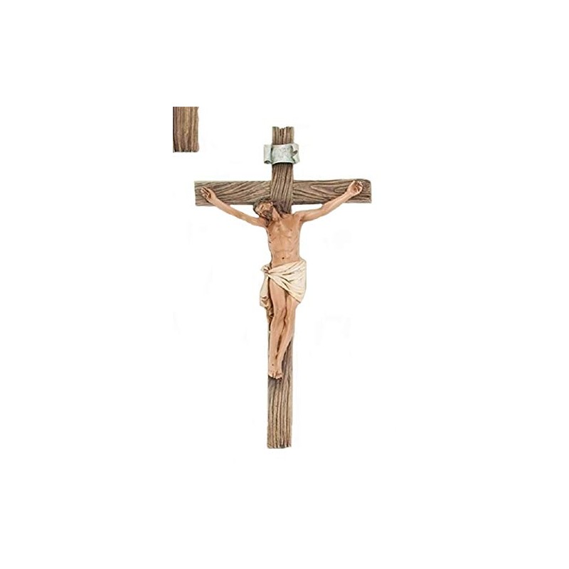 - Features crucifix design with traditional figure corpus and textured wood look cross