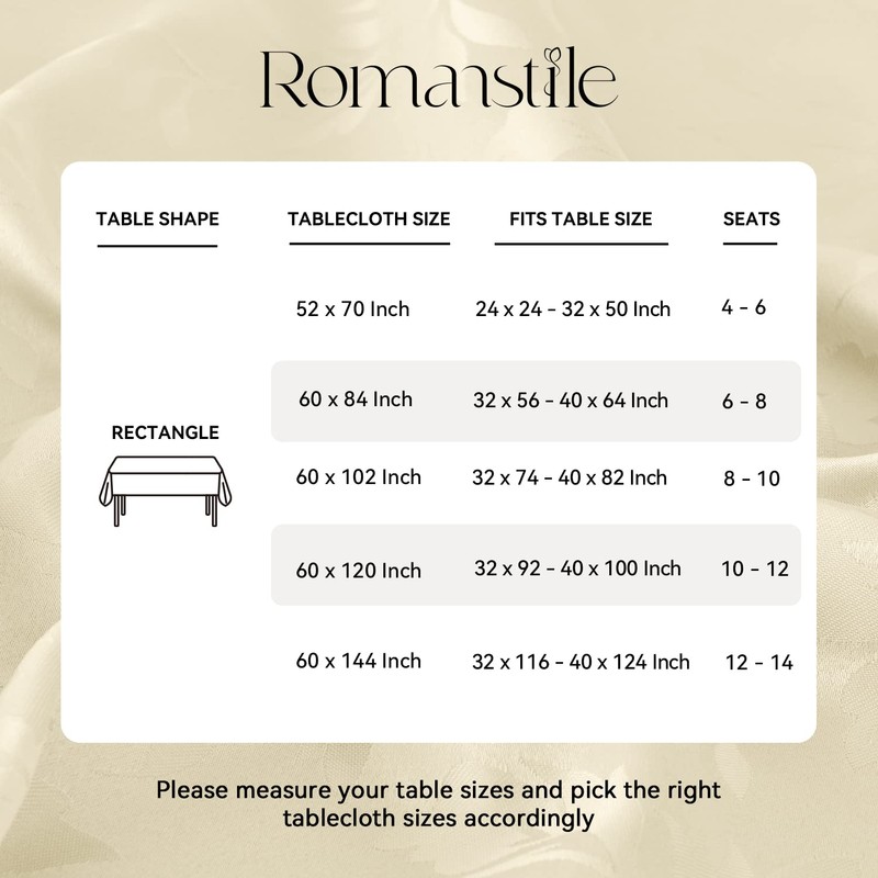 - MEASUREMENTS: Each package includes 1 piece of jacquard rectangle tablecloth measuring 60 W by 120 L inch. The tablecloth size is usually larger than your table size, please refer to the size guide before purchasing.