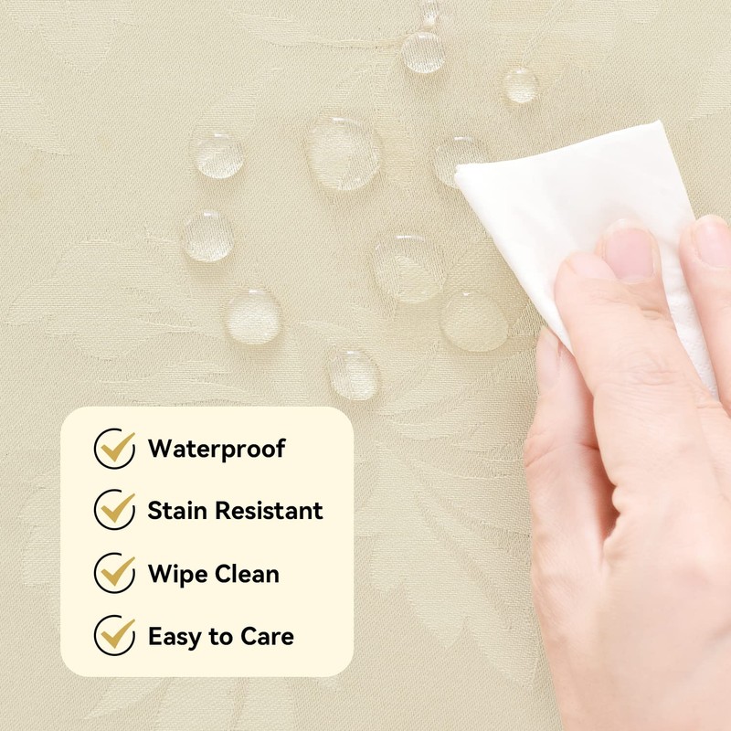 - EASY TO CARE: All liquids bead up on the tablecloth for easy cleaning; Machine wash in cold water and tumble dry on low; Iron on low temperature; DO NOT BLEACH.
