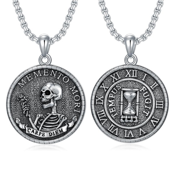 ROMANTIC WORK Memento Mori Necklace 925 Sterling Silver Memento Mori Pendant Chain Gothic Skull Jewellery Gift for Men Women, Sterling Silver, No Gemstone