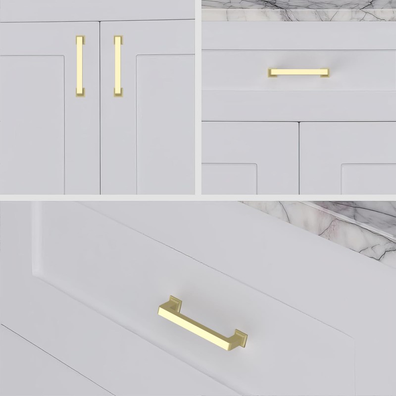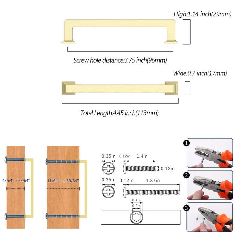 - 【Package Description】There are 10 brushed gold handles you will receive, each with 4 screws (2 regular screws and 2 breakaway screws that you can cut to the desired size). Each pull is packaged separately to prevent scratches.