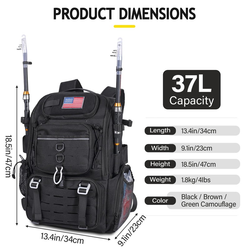 - 37L Capacity: demension: 13.4" x 9.1" x 18.5"; enough space for you to carry your essentials for a day of fishing or other outdoor activities