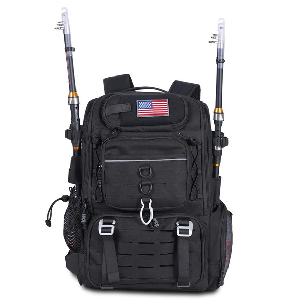 Romatime 37L Fishing Tackle Backpack with Rod Strap, Insulated Outdoor Tackle Bag with Protective Rain Cover, Black