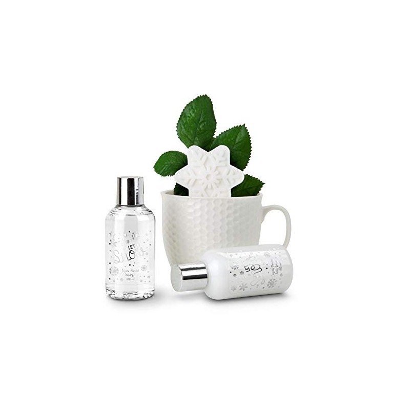 - 100 ml shower gel, 100 ml body lotion and 1 snowflake soap (50 g). Everything smells of jojoba almond.