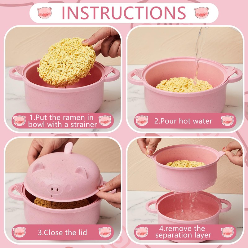 - Complete Set with Piggy: this microwave ramen cooker package includes a bottom soup bowl, a middle drain bowl, top bowl, and a set of spoon, chopsticks, and fork; With its round shape, smooth curves, and delightful piggy accents, a cute tableware for students, office workers, or anyone who loves cute and convenient dining
