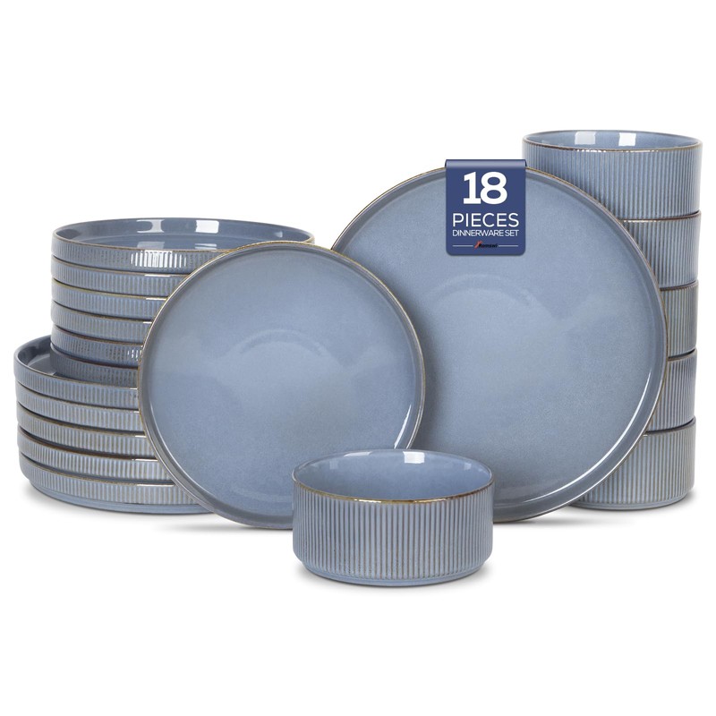 Romswi Ceramic 18Pcs Dinnerware Sets,Stoneware Plates and Bowls Set for 6, Chip & Scratch Resistant Ribbed Dish Set, Handmade Reactive Glaze, Oven, Microwave & Dishwasher Safe, Gray Blue