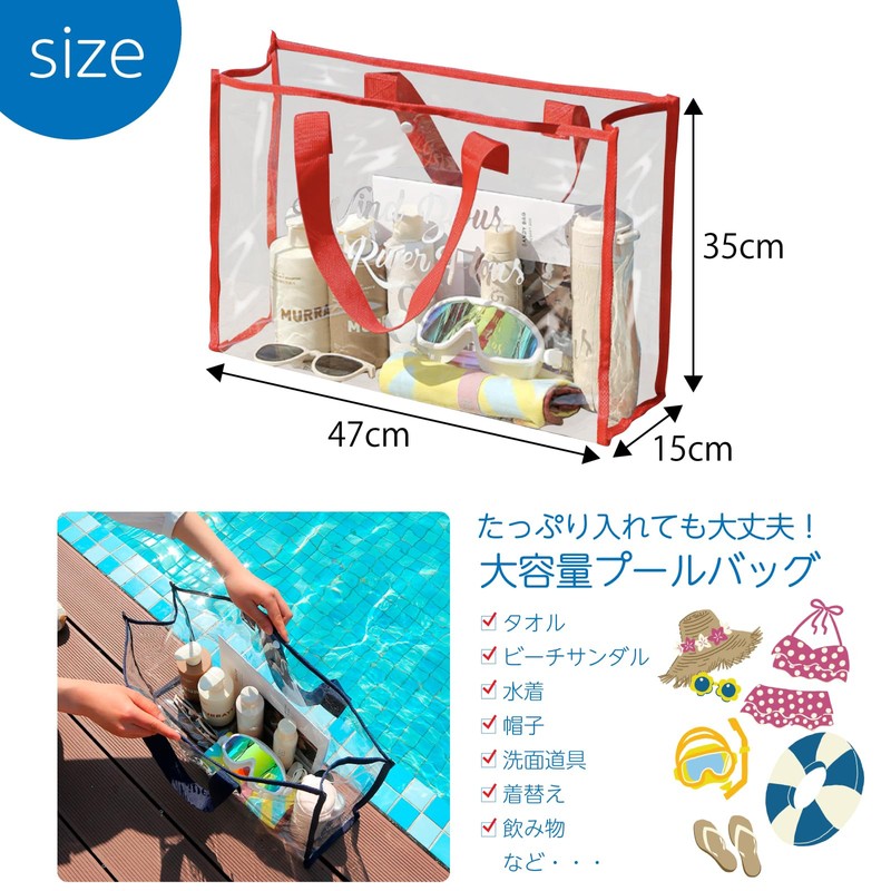 - Large Capacity: A large clear bag that can hold plenty of items such as towels, flip flops, swimsuits, hats, changes, drinks, and mobile phones
