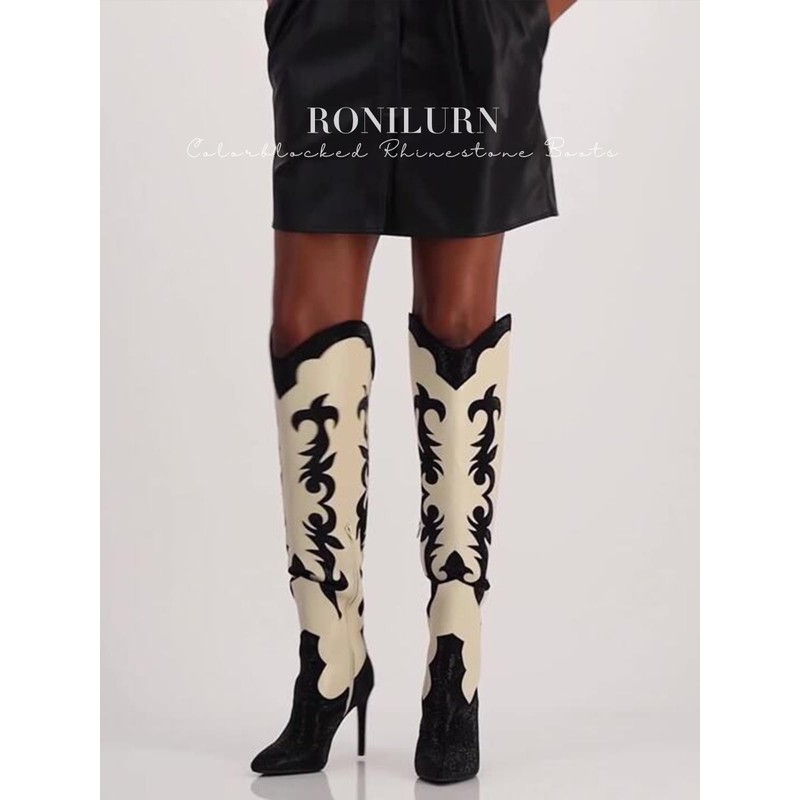 - FASHION KNEE HIGH BOOTS: These knee high cowboy boots are absolutely gorgeous! Stylish black and beige color blocking design to enhance your dressing style. They are very eye-catching and surprisingly comfortable for the height and pointed toe.