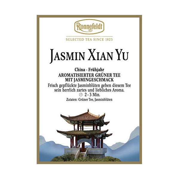 - Jasmine Xian Yu by Ronnefeldt - A flavoured green tea with a brewing time of 2-3 minutes. Please always observe the recommended water temperature and brewing time - this is the only way to get a safe food.