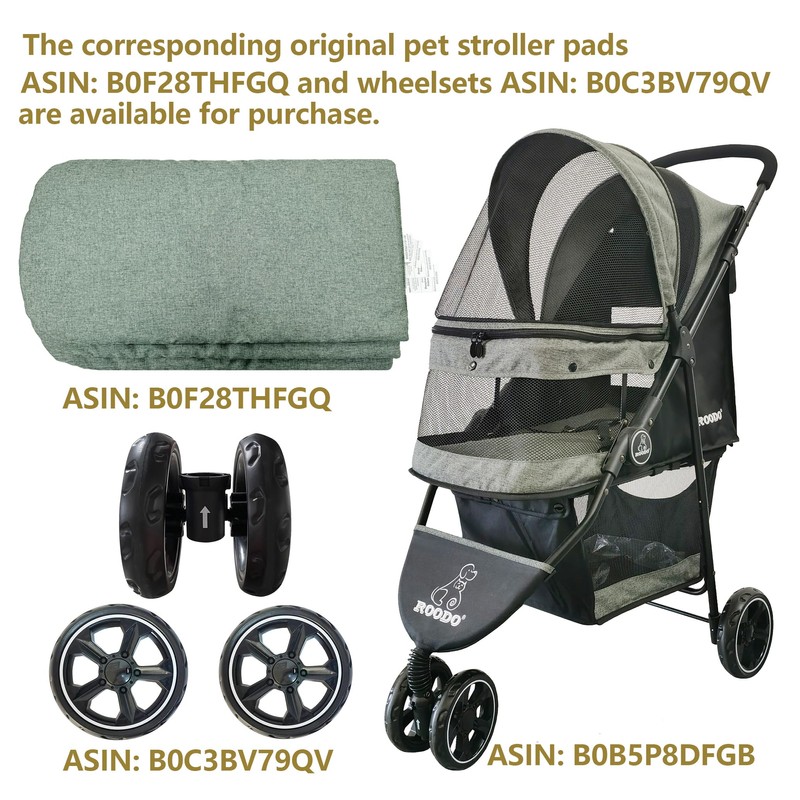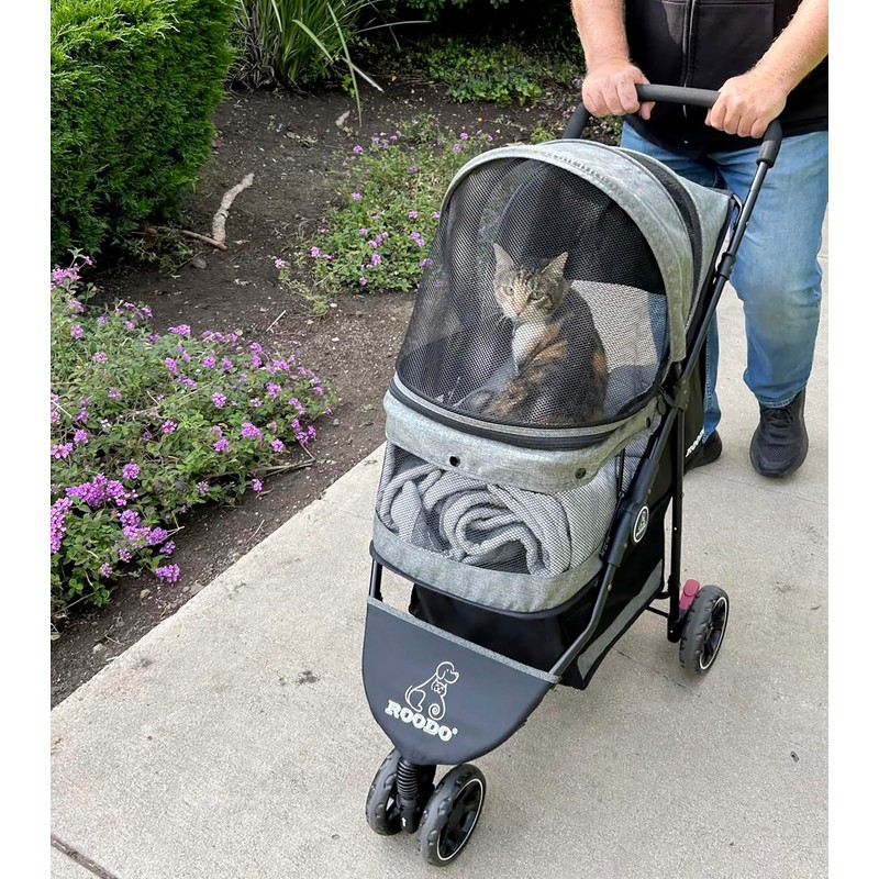 - ROODO multifunctional three-wheeled pet stroller is smooth and easy to use. The pet rest area is covered with multi-directional breathable nets to enjoy the fresh air and protect your pets from insects. Equipped with a storage basket for easy storage of items. The pet stroller can be folded easily and compactly enough to fit into the trunk of the car. It is a great choice for walking, jogging, and traveling. Bring your pet to enjoy outdoor activities with you.