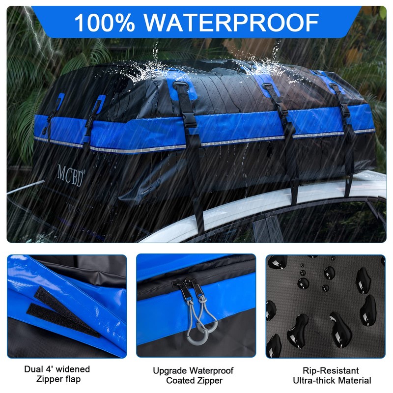 - 🚗UPGRADED WATERPROOF ZIP: We notice that the straps of other cargo bags can easily rip from the seam, so the MCBD roof bag doubly reinforced the strap seam. And all seams of this cargo bag are heat welded and stitched to ensure they are watertight. 100% Waterproof, waterproof zipper with 6 inches extra wide velcro zipper flaps. It provides perfect weather protection even in extreme conditions such as wind, sun, rain, snow, and sand.