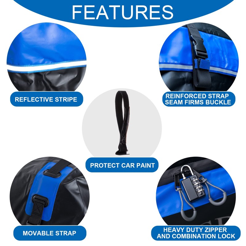 - 🚗SAFETY COMES FIRST: Three reinforced adjustable straps to keep the cargo carrier more secure firmly. Come with bonus combination lock, it will not only prevent the zippers from slipping, but also adds security to luggage. Wrapping the belt and fixing it with velcro, say goodbye to straps flapping in the wind while you're driving down the road. Even thoughtful logo design of the outermost extension of the zipper cloth has reflective strips, escort for your night journey.