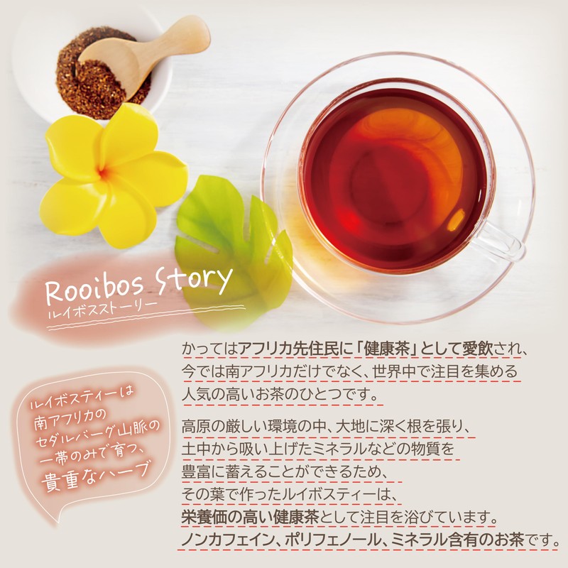 - Rooibos is a beef of the Creme, native to the Sedarberg Mountains of South Africa, and the tea made from this tree is called "Rooiboste". While Rooibos tea is highly recognized in Japan, Rooibos is actually a precious plant that is grown only in South Africa, around the world. The rich and aromatic Rooibos tea is made with a spray-dry thick powder formula that gives it a rich and deep taste while taking advantage of the aroma and flavor