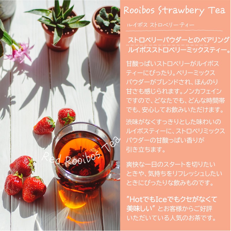 - The fresh, sweet and sour scent of freshly picked strawberries enhances the flavor of your refreshing tea. A clear, beautiful strawberry tea with a pleasant fresh strawberry flavor. Sweet and sour filled strawberries containing many anthocyanine and polyphenol. Just drink and let your heart move and feel like a laughter with this authentic strawberry tea anytime, anywhere. Powder Reibos Strawberry Tea is a new catach fruit tea with a slightly sweet and sour strawberry powder and Rooibos tea powder