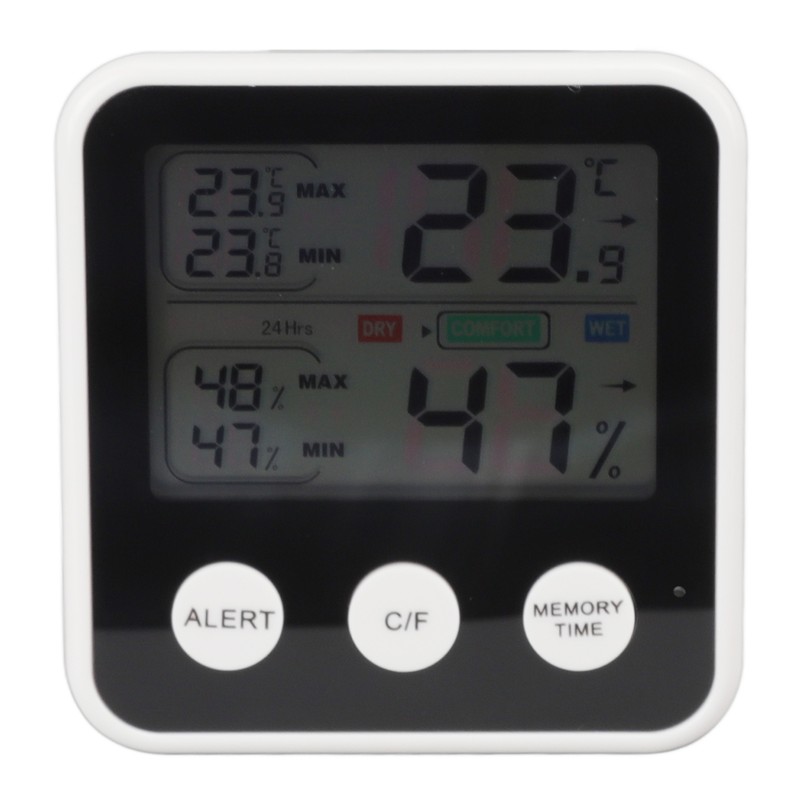 1、3.7in LCD Display: This humidity sensor adopts 3.7in large LCD display with clear backlit, reading more easily in different environments and angles. 2、24 Hours Records: This humidity sensor shows maximum and minimum humidity and temperature records for the last 24 hours, so you can take measures in advance. 3、3 Button Control: This digital hygrometer features 3 buttons smart design, Celsius degree and Fahrenheit degree switchable, easy to operate. 4、Comfort Level Indicator: This digital thermometer has 3 levels of symbols, including wet/comfort/dry, which help you maintain a comfortable environment in your home. 5、Wide Application: This indoor thermometer is suitable for home, bedroom, baby room, kitchen, greenhouse, guitar room, office and wine cellar.