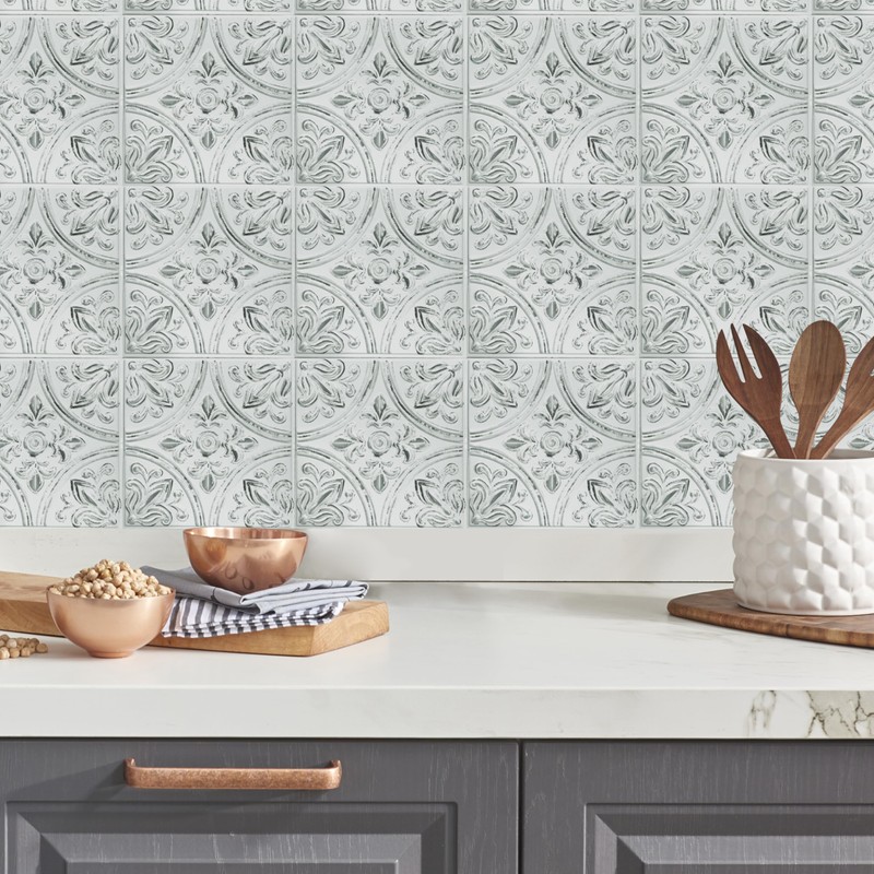 RoomMates TIL4623FLT StickTiles White Tin Peel and Stick Tile Backsplash, 10.5 inch x 10.5 inch, 4 Count (Pack of 1)