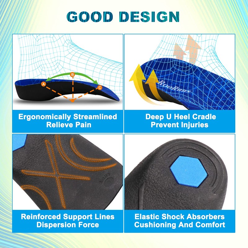 • Buen diseño: el arco de la plantilla de soporte de arco está ergonómicamente aerodinámico para levantar correctamente tu arco colapsado y aliviar el dolor de la fascitis plantar. El talón profundo en U cubre todo el talón, endereza las piernas y evita lesiones durante el movimiento. Las líneas de soporte de suela reforzada de inserciones ortopédicas permiten que la plantilla mantenga más peso y sea más segura. Los amortiguadores elásticos plantares también proporcionan una amortiguación eficaz para cada paso que tomes.