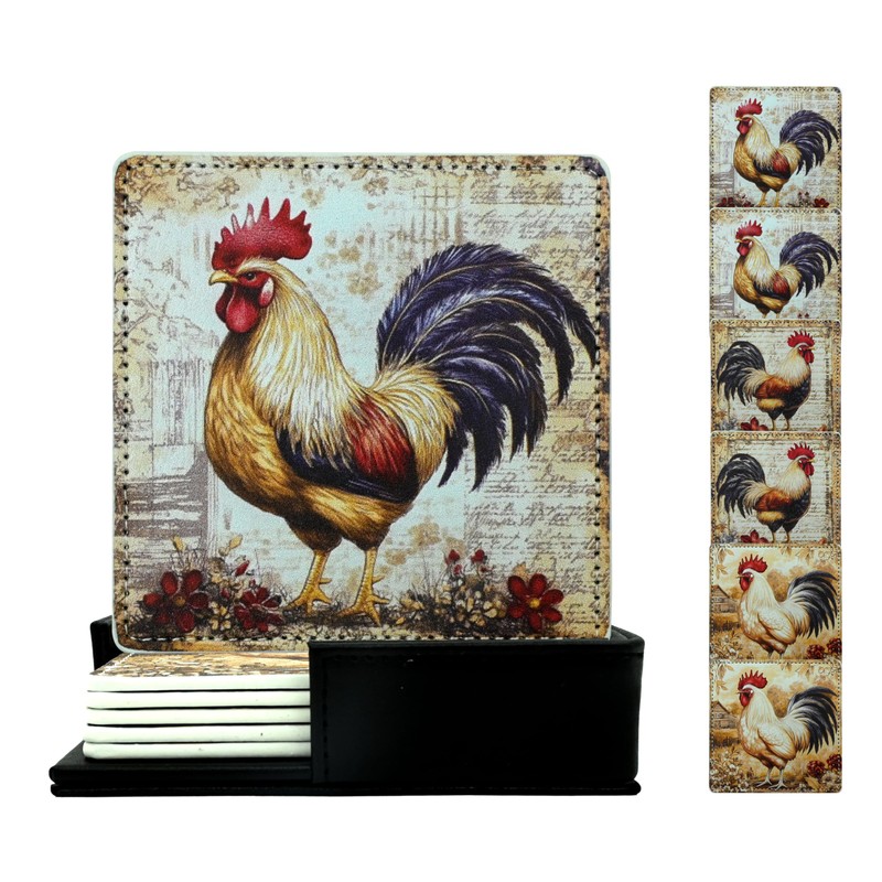 Rooster Coasters Square Leather Drinks Coaster Set with Holder for Coffee Table Bar Home Decor 4 Inches Set of 6