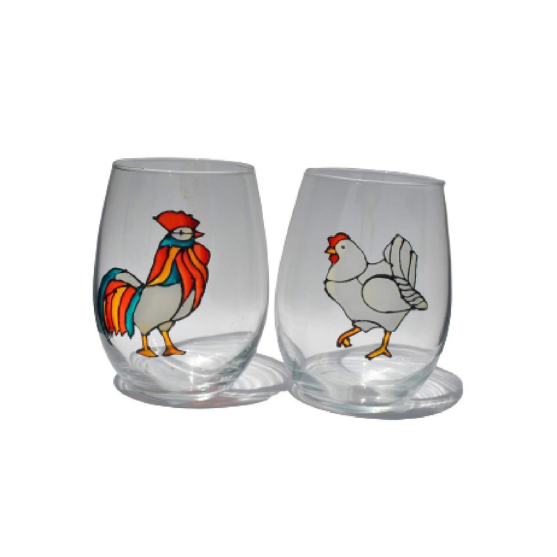 Rooster Hen Stemless Wine Glasses Set 2 Hand Painted Fall Home Decor