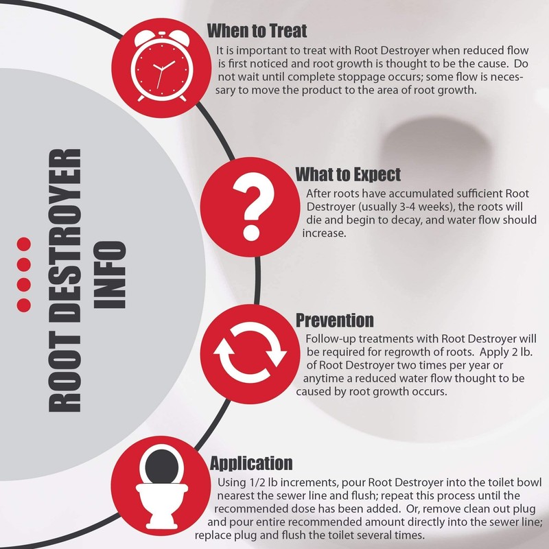 - Use Root Destroyer at the rate of 2 lb. in an active 300 gallon septic tank 2 twice a year or anytime you have reduced water flow thought to be caused by root growth occurs.