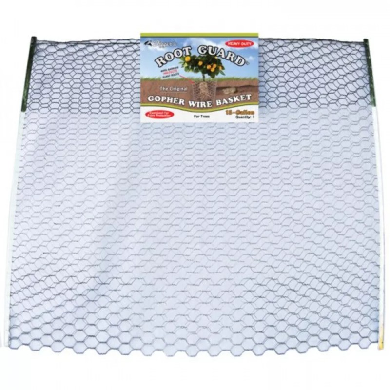 RootGuard Heavy Duty Gopher-guard baskets are made of twenty-gauge, three-quarter-inch hex mesh, and the wire strands are hot-dipped galvanized before weaving. They are packaged flat for easy storage, generously sized to allow for root growth, top 3 inches painted green to blend into the landscape, can be removed at the end of the season for reuse the next year. The gopher-guard baskets are free standing once formed for easy planting, and to permit upsizing to allow for even more root growth. Humane and effective, these sturdy baskets are superior to chicken or aviary wire for barring gophers from your plant's roots. Just set the basket in the plant hole with the green wire above-ground to block the overland route. Put the plant inside, backfill with soil and you're done!The fifteen-gallon Tree Size basket is also made of twenty-gauge, three-quarter-inch hex mesh, but the wire strands are hot-dipped galvanized before weaving. The weaving process then creates cracks in the galvanized coating, allowing the basket to break down in three to five years—which is just enough time for trees to become established and mature enough to resist damage from gnawing gophers, but not so long that growth is inhibited by root girdling. Packaged flat for easy storage