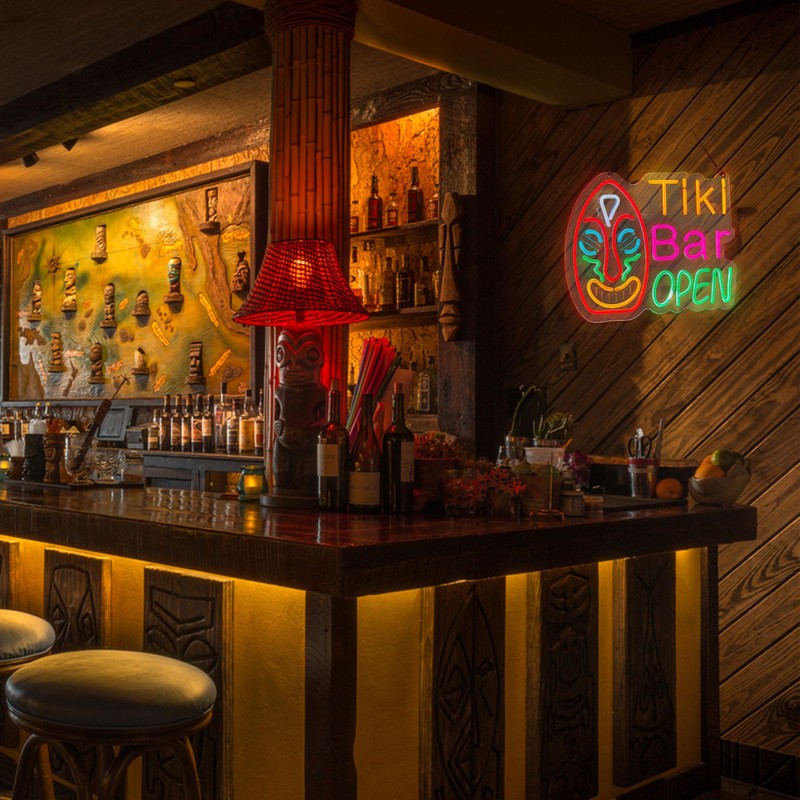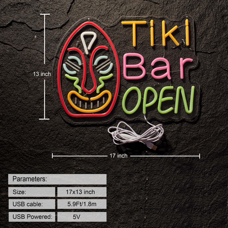 - Tiki bar open neon sign is made by flexible silicon LED strip lights and fixed on an acrylic clear board