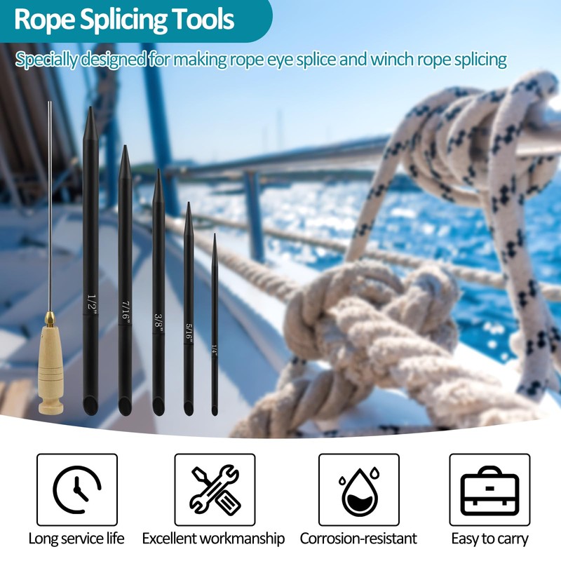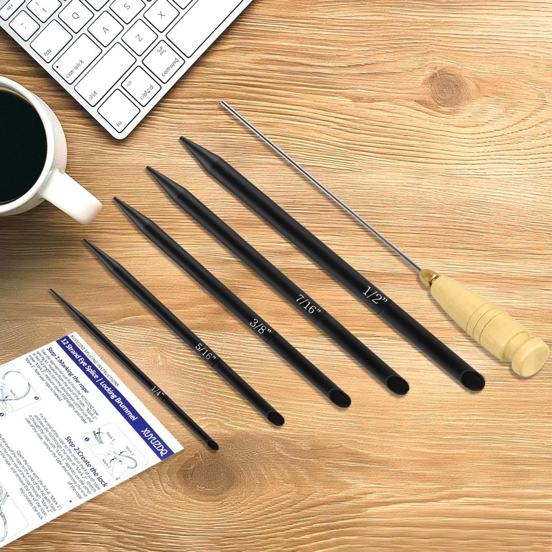 - 【6-In-1 Rope Splicing Tool】 XUYUZDQ rope splicing kit tool covers commonly used braided rope sizes on the market. Includes 1/4", 5/16", 3/8", 7/16" and 1/2" splicing fid, and a rope fids pusher. Note: The above dimensions refer to the diameter of the braided rope, not the diameter of the product.