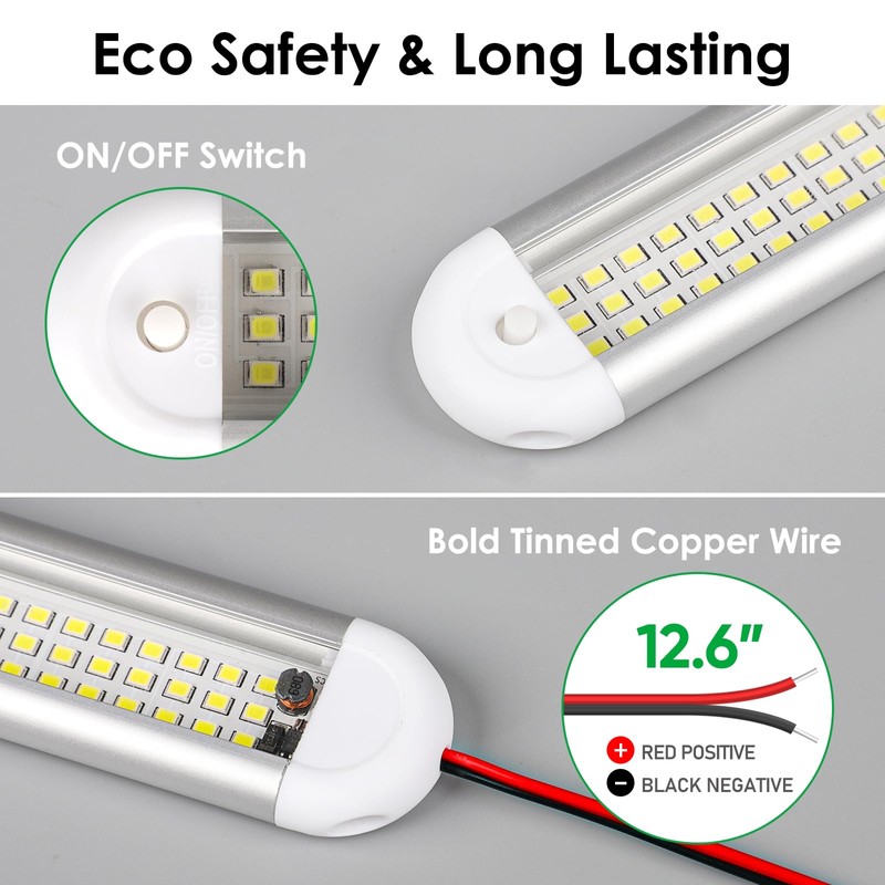 - 【High Quality】- This 12 volt led lights for rv interior adopts 11.8in extension connecting cable, anti-scratch aluminum alloy foundation and efficient light transmitting PC film to achieve ultimate durability, flexibility and efficient heat dissipation. Stainless steel clips, screws and strong self-adhesive that come with the package makes the installation of this 12v led light bar a breeze and optional